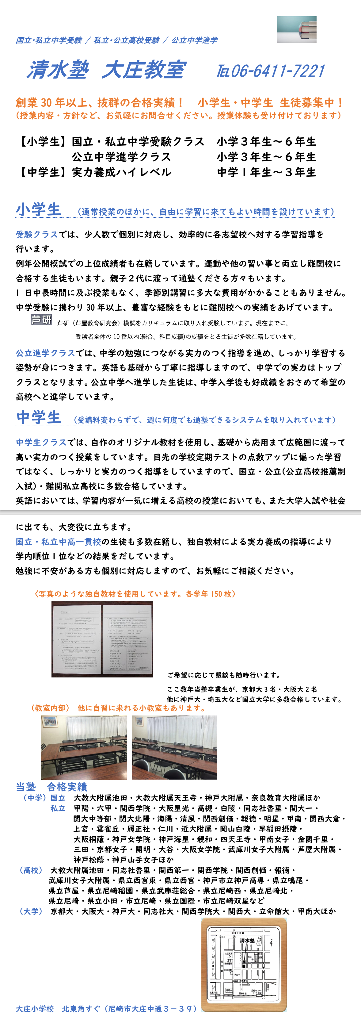 創業以来30年間以上、入塾テストは行っておりません。国立・私立中学受験クラス においても、授業は午後7時半頃までに終了しています。少人数で アットホームな